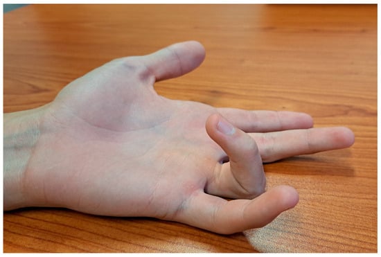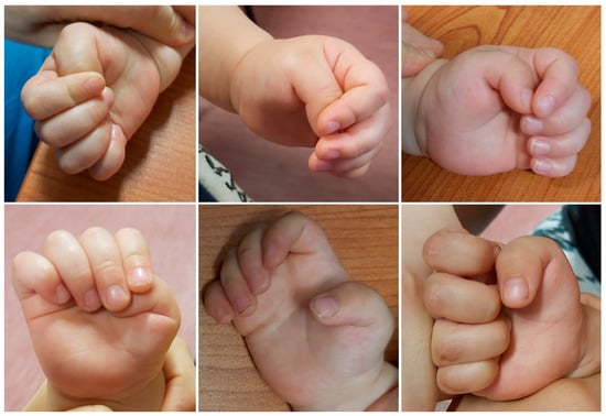 Patients with congenital clasped thumb present clinically with a flexion and adduction deformity of the thumb, which is usually positioned in the palm underneath the other four digits (Figure 5) []. Although the thumb-in-palm posture is physiologic up to 6 months of age, it is expected that the thumb will be easily passively extended and that active extension will be present after this period. In patients with a clasped thumb, this does not happen and there is either continued weakness or a complete lack of thumb extension, leaving a thumb in palm deformity with an MCP joint fulcrum (Figure 5) [,,]. In the most severe cases, with complete absence of the EPL and EPB, the thumb crosses almost the entire palm and lies at the level of the base of the 5th finger []. This deformity is also often associated with other secondary deficiencies such as first web space narrowing and contracture, collateral ligament tightness, palmar plate contracture, and changes in joint congruency []. According to the severity of the deformity, Tsuyugushi classified these deformities into the following three types: Type I—supple clasped thumb (the thumb could be passively abducted and extended against the resistance of thumb flexor, without other digital anomalies); Type II—clasped thumb with hand contractures (the thumb could not be passively extended and abducted, with or without other digital anomalies); Type III—clasped thumb associated with arthrogryposis [,].