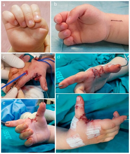 Intra-operative photographs of the surgical treatment of a clasped thumb (Tsuyugushi Type I). An attempt at conservative treatment with a thumb extension splint was unsuccessful and led to an indication for surgical treatment. (a,b) Preoperative photographs. (c,d) A four-flap Z-plasty and release of the intrinsic tenar muscles was performed to widen the first web space, and an MCP joint stabilization (double breasting of the capsule and K-wire fixation) and a tendon transfer of the extensor indicis were also performed. (e,f) Immediate postoperative photographs to illustrate the correction achieved.