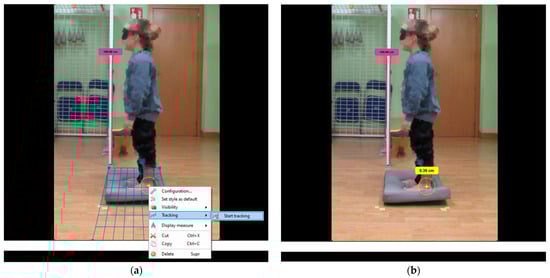 To track body displacement, participants were recorded in the left sagittal plane using a Samsung NX3000 camera (Samsung Electro-Mechanics, Seoul, Republic of Korea) placed 1.5 m away and at a height of 50 cm relative to the participant, allowing visualization of the entire body while standing. Subsequently, the open-access software Kinovea® Motion Analysis Software (GNU General Public License version 2) was utilized for video analysis [27]. The tracking displacement tool in Kinovea® (version 0.9.4) was employed to estimate body displacements in centimeters across the different frames of the video (Figure 1a,b).