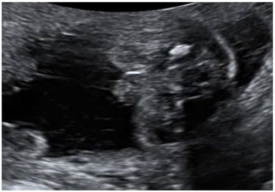 We present a case of a 30-year-old primigravida, with no relevant medical history who had an uneventful pregnancy up to the point of her routine second-trimester ultrasound anomaly scan, at 20 weeks’ gestation. In our service, all pregnant women are offered three detailed fetal scans throughout pregnancy: first at 11 to 13 weeks for dating, estimating risks of common chromosomal abnormalities, structural check-up, and preeclampsia screening; the second is planned around 20–24 weeks for fetal anomaly scan and cervical length measurement, and the third is at 30–34 weeks to check for growth and fetal dopplers [5,6]. In the presented case, the risk for common chromosomal abnormalities estimated by the first trimester combined scan was low. Common blood tests were normal and ruled out maternal infections. There was no consanguinity. Dating of pregnancy was performed as per guidelines by first-trimester measuring of crown-to-rump length [7]. At the second-trimester anomaly scan, the fetus was measured small-for-gestational age, with a 2-week growth delay, there were oligohydramnios (deepest amniotic fluid pool of 2 cm), ambiguous genitalia (Figure 1), and hyperechogenic bowel [8]. Doppler measurements in the umbilical artery, ductus venosus, middle cerebral artery, and uterine arteries were normal, making the diagnosis of fetal growth restriction due to placental insufficiency less likely [9]. There were no features of fetal infections or other structural anomalies. The parents were informed and consented to invasive prenatal genetic testing by amniocentesis. Amniotic fluid was sent for initial genetic testing (karyotype, SNP array, a gene panel for cystic fibrosis because of the hyperechogenic bowel) and fetal infections [10]. Fetal karyotype indicated a normal male fetus, 46, XY, and the SNP array came back normal. Fetal infections (Cytomegalovirus, Toxoplasma gondii) and cystic fibrosis were ruled out. After the initial normal results, the parents were informed about the possible monogenic etiology of the fetal features seen on the scan and the next available options of testing—whole exome Sequencing (WES) and whole genome sequencing and opted for this test. We do store, per protocol in our unit, with patients’ consent, the amniotic fluid after the initial invasive procedure for future testing if required. Parents agreed to WES which identified a heterozygous variant, of uncertain significance, NM_001193307.1:c.2054G>A p.(Arg685Gln), in the SAMD9 gene, making the diagnosis of autosomal dominant MIRAGE syndrome possible. This missense variant, c.2054G>A p.(Arg685Gln), that causes an amino acid change from Arg to Gln at position 685, has previously been described as disease-causing for MIRAGE syndrome by Buonocore et al. [4]. Further, parental testing was undertaken, and the fetal variant was not identified in parental tests, demonstrating the “de novo” origin in the fetus. Therefore, because the fetal variant is absent in healthy cohorts and is missing in familial segregation, due to the availability of this evidence, the variant has been reclassified from a variant of uncertain significance (class 3) to likely pathogenic (class 2), confirming the diagnosis of MIRAGE syndrome in the fetus. After extensive counseling, the parents opted for termination of pregnancy. Counseling included a discussion on the risk of future pregnancies, which was estimated to be low because the variant identified in the index was de novo (although, rarely germline mosaicism in one of the parents is possible). Despite the challenges posed by the COVID-19 pandemic, the clinical management and work-up for this case remained unhindered. The dedication of healthcare professionals and the implementation of safety protocols ensured the timely retrieval of results and the provision of necessary care for the parents [11].