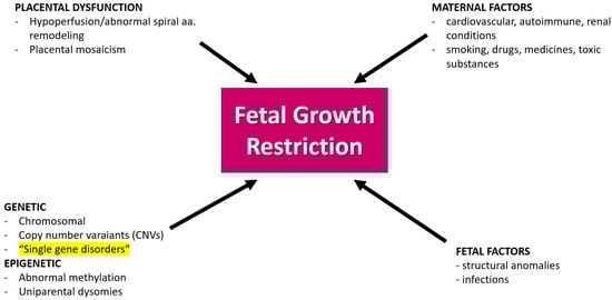 Causes of fetal growth restriction in prenatal medicine. Most frequently, FGR is a consequence of placental insufficiency. Other causes are maternal disorders, maternal exposure to drugs or toxic factors, and fetal factors like infections or structural abnormalities. Single gene disorders, like in the case we present here, are rare causes of FGR (highlighted in Figure 2), nevertheless, they should be taken into consideration in the differential diagnosis; aa—arteries.