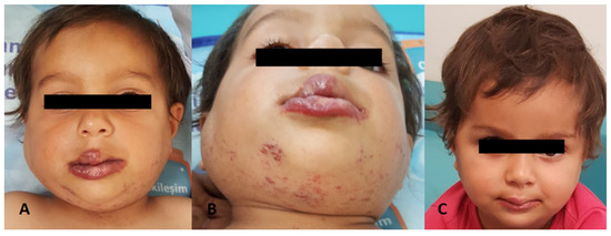 A nine-month-old girl. Parotid, maxillofacial hemangioma treated with pulse methylprednisolone and propranolol (did not respond adequately to propranolol only). (A,B) before treatment; (C) 3 months later.