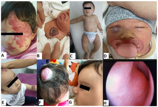 Examples of infantile hemangiomas with indications for treatment (baseline). (A) A female patient with PHACES syndrome at 2 months of age. (B) A six-week-old female patient with an ulcerated hemangioma of the chest. (C) A five-month-old male patient with multifocal hemangioma. (D) A six-week-old girl with hemangioma located on the lower eyelid. (E) Multifocal mixed IH. (F) A one-year-old male patient with a large mixed hemangioma of the scalp and extremities. (G) Profile of patient with IH of the nasal tip (cyrano node) at 2 months of age. (H) A four-month-old girl with a subglottic hemangioma presenting with stridor.