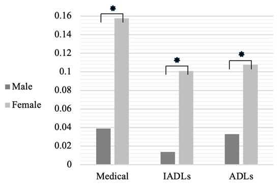 Males differed from females in medical difficulties, IADLs, and ADLs (all p < 0.01, respectively). See Figure 1.