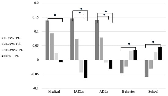In medical difficulties, children in 0–199% of poverty significantly differed from those with 400% or greater (p < 0.05). In IADLs and ADLs, children in 0–199% of poverty differed from those with 300–399% and 400% or greater (all p < 0.05, respectively). Children in 0–199% of poverty significantly differed from those with 400% or greater in behavior (p < 0.01) and school (p < 0.05). Poverty was not significantly associated with social competence. See Figure 2.