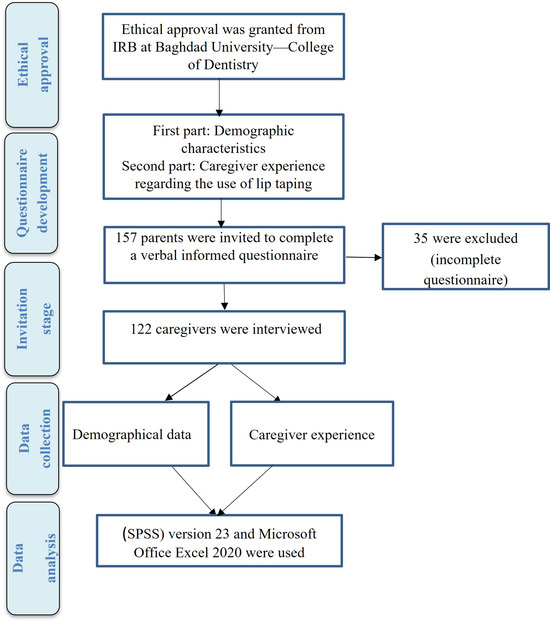 A retrospective survey was undertaken across three prominent clinical centers: the orthodontics department, the maxillofacial department, and the cleft center at the College of Dentistry at the University of Baghdad, where cleft lip and palate patients from different areas of Iraq are received to direct those patients’ families to the treatment protocol for their affected children, starting from the first day of infant life, with orthopedic treatment ending with the orthognathic surgical procedure that might be needed in the late teens. The primary study protocol is depicted in Figure 1 (flowchart). Inclusion criteria encompassed caregivers of both sexes, which could be parents or any other person from the family who was taking care of the affected infant, spanning all ages, caring for infants diagnosed with bilateral cleft lip and palate (CLP), and registered at the aforementioned clinical centers in Baghdad. The current survey was performed for caregivers of babies with bilateral cleft lip and palate who underwent orthopedic treatment by using lip taping prior to surgical lip closure to check their experience with such a type of orthopedic management.