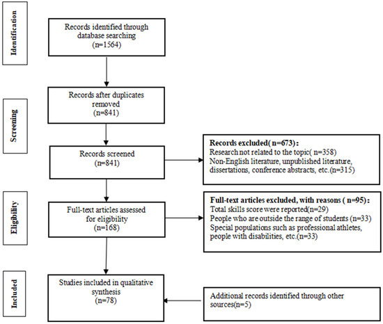 The inclusion criteria were as follows: (1) studies examining the associations between motor skills and AA were included, (2) studies that assessed gross or fine motor skills separately were included, (3) the participants were typically developing primary to high school students, (4) studies published in peer-reviewed journals in English until March 2023, and (5) quantitative studies.