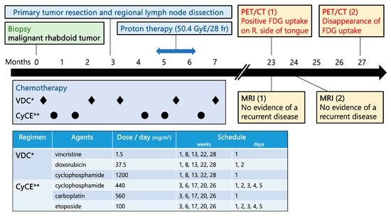 Timeline of the multimodal treatment and diagnostic procedures. Multimodal treatment, including chemotherapy as per the European Pediatric Soft Tissue Sarcoma Study Group (EPSSG) Non-Rhabdomyosarcoma Soft Tissue Sarcomas (NRSTS) 2005 [5], consisting of VDC* (vincristine, doxorubicin, and cyclophosphamide) and CyCE** (cyclophosphamide, carboplatin and etoposide); tumor resection with lymph node dissection; and proton beam therapy, was performed. Approximately 16 months later, PET-CT showed positive FDG uptake on the right side of the tongue, suggesting a recurrence. However, a series of MRI showed no evidence of a recurrence. The area first seen on PET-CT eventually resolved. p-Tx; duration after completion of chemotherapy.