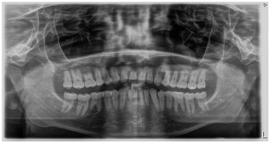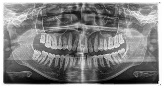 Panoramic radiography, performed in 28 November 2018 (Densply Sirona, Charlotte, NC, USA, Orthophos SL 2D), revealed a full dentition and shortened tooth root length: 24, 25, 31, 32, 33, 34, 35, 41, 42, 43, 44, 45. The X-ray is presented in Figure 3.