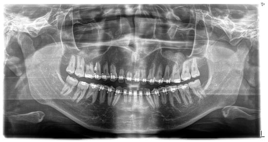 The novel meta-analysis shows that regardless of the orthodontic method, the level of root resorption remains similar. The authors conclude that external apical root resorption (EARR) should be avoided because it is one of the most serious complications of orthodontic treatment []. The etiology of root resorption is not clear. Patients with a history of dental trauma, dental treatment, and systematic conditions influence the prevalence of apical root resorption []. The severe resorption observed in the patient could be a result of impaired metabolism and endocrinological problems, resulting from insufficient levels of growth hormone and estrogen, as reported among patients with Turner syndrome []. The main goal of the second hormone is to prevent bone resorption, so lowering its level often leads to consequences such as increased bone fragility, observed in osteoporosis []. This could also influence the resistance of the roots to damage and may lead to resorption, as observed in our patient. A possible way of preventing root resorption could be aligner treatment [,], because the treatment with aligners was proved to cause a smaller amount of apical root resorption when compared to the fixed appliance therapy. Although the amount of ARR is smaller when treatment with splints is applied, it is still present. The treatment with aligners was not popular at the time, when our patient began the active phase. To the best of the authors’ knowledge, there are no case presentations of this kind of treatment, and considering the lower bone density level in females with Turner syndrome [], one could assume that the bone at the treatment site would behave differently.