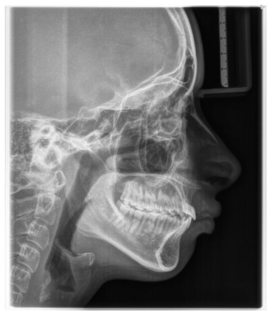 As in the data collected from the literature [], the patient presented a class II deep bite, typical for women with Turner syndrome. She did not show any hypodontia, typical of syndromes with orofacial expression []. Our patient suffered from narrow airways, which might be typological for several types of malocculsions. Our patient suffers from a class II deep bite, which is also one of the factors that could cause narrowing of the airways [,]. As shown in other research [], class II corrections result in a widening of the airways. This phenomenon was also present in our patient.