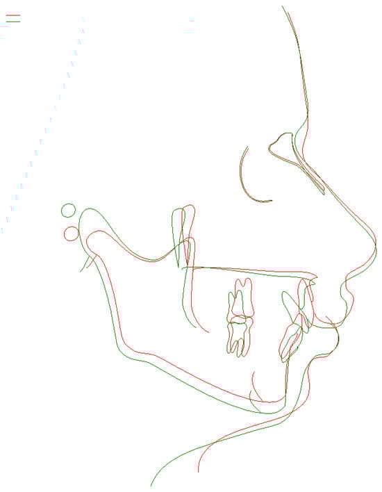 Pre- and post-treatment cephalometric superimposition. Green—post treatment, red—pre-treatment.