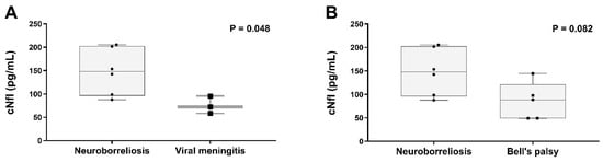 CSF NfL levels in children with neuroborreliosis vs. viral meningitis (A) and in children with neuroborreliosis and Bell’s palsy (B). Comparisons were performed with Mann–Whitney U test.