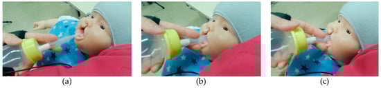 Feeding procedure. (a) Nipple Insertion into the Mouth; (b) Maintaining Feeding; (c) End of Feeding.