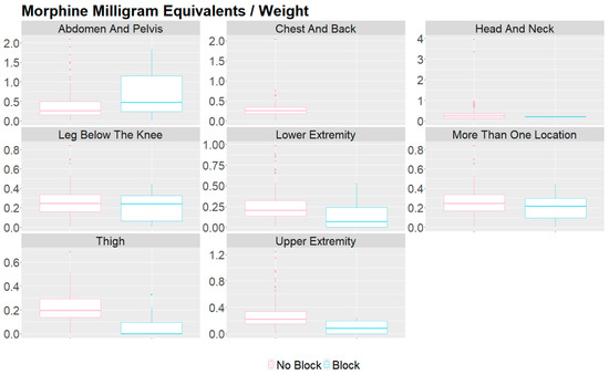 Box plot of MME/kg comparison between groups that received a peripheral nerve block and those that did not for vascular malformation procedures in various body regions. The y-axis is morphine milligram equivalents per kilogram. The points located beyond the whiskers are outliers and are located anywhere from (Minimum to Q1 − 1.5*IQR) and (Q3 + 1.5*IQR to Maximum).