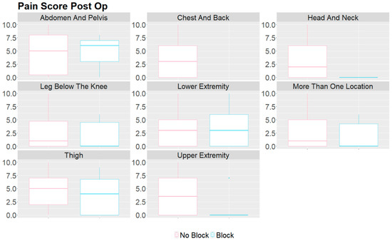 Box plot of MME/kg comparison between groups that received a peripheral nerve block and those that did not for vascular malformation procedures in various body regions. The y-axis is the postoperative pain score on a scale of 0–10.