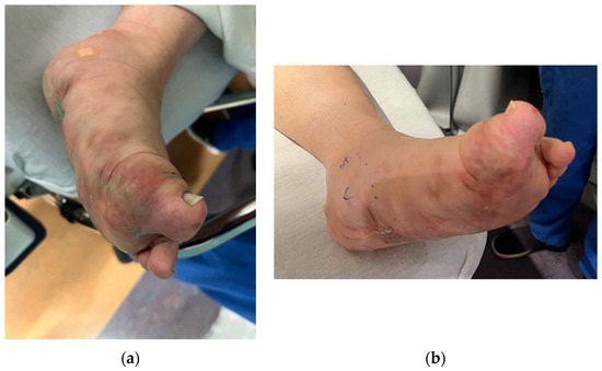 Figure 4. (a) Vascular malformation of the left foot showing the change in coloration and swelling of the limb before intervention. Peripheral nerve blocks were utilized to provide analgesia in the postoperative setting. (b) Upon repeat intervention, the patient’s foot showed improvement in swelling and discoloration. Patient consent was obtained for the use of the images. - When administering peripheral nerve blocks in pediatric patients, it is essential to consider potential complications from the nerve block and injecting the sclerosing/embolizing agents. The risk of nerve injury from nerve blocks is low, around 2 to 4 per 10,000 blocks in children, but it should still be considered in all patients undergoing this type of therapy [15]. One patient developed a sciatic nerve injury following therapy with a peripheral nerve block. The malformation was located in the hip and close to the sciatic nerve (Figure 5). A quadratus lumborum nerve block was performed intraoperatively for postoperative pain control [16]. The patient made a full neurologic recovery after several months. The nerve injury was likely due to the therapy and unrelated to the peripheral nerve block. However, determining if the malformation is close to a nerve should raise concerns that signs of a nerve injury may be initially masked by a peripheral nerve block. As previously reported for other blocks by Pickle et al. [17] encountered no bleeding complications at the block sites after enoxaparin administration. Continuous patient monitoring during and after the procedure is vital to ensure their safety. Close observation for potential complications related to the nerve block, such as nerve injury, is necessary. At the UPMC CHP, we performed home phone call follow-ups for all the patients who received peripheral nerve block follow-up. Some of our patients required pre- and post-procedure anticoagulation therapy, and we investigated if any of our patients developed any hematoma at the needle injection site. In addition, some patients require a longer time to recover from peripheral nerve blockade.