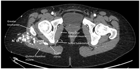 Figure 5. CT scan imaging of a right hip arteriovenous malformation with involvement close to the sciatic nerve. This patient had undergone several sclerotherapy procedures and received a quadratus lumborum nerve block for postoperative pain management. Following one therapy, the patient was noted to have a sciatic nerve injury.