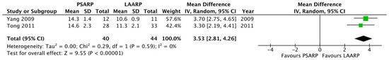 Forest plot comparison of length of hospitalization in the LAARP versus the PSARP groups [2,10].