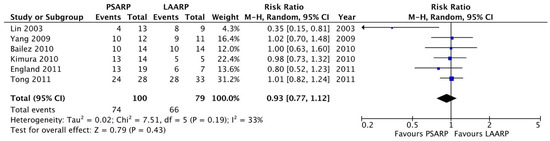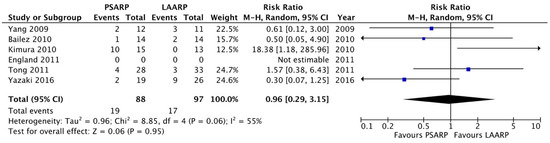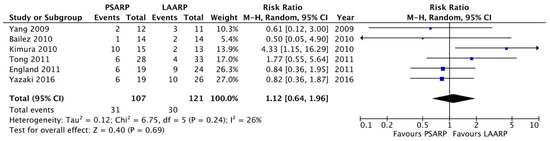 Forest plot comparison of early postoperative complication in the LAARP versus the PSARP groups [1,2,3,8,9,10].