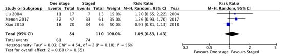- Six papers (297 pts) in the systematic review and three comparative studies (247 pts; 117 one-stage, 130 staged procedures) in the meta-analysis to compare the results of the single- versus the three-stage correction of high ARMs [4,5,6,7,12,13]. All studies were retrospective.
