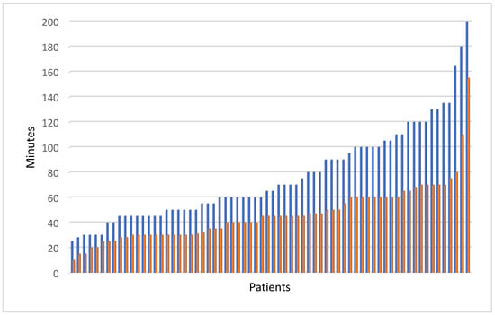 Duration of surgery in the target (blue columns) and control groups (orange columns)—from the shortest to the longest.