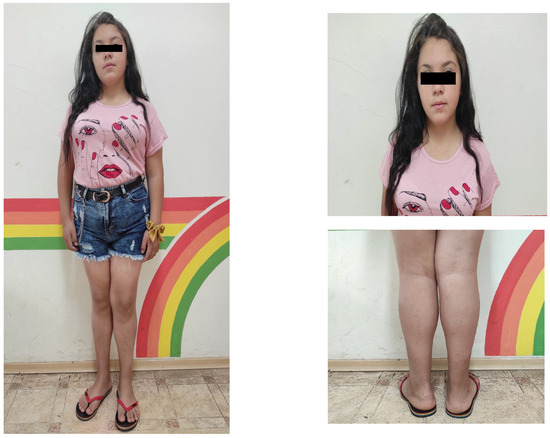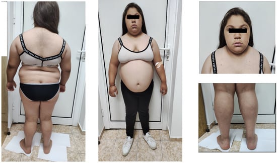 At admission, the girl was in an impaired general condition. A “mask-like face” with rough facial features, thick lips, and macroglossia was notable on physical examination. She had very dry skin with acanthosis nigricans on the neck, axillae, and arms. Abnormal fatty tissue distribution with increased accumulation in the abdominal area was observed. No hyperplasia of the thyroid gland and no abnormalities in the respiratory and cardiovascular systems were evident. She was in the fifth Tanner stage of pubertal development. The patient experienced difficulties in rising from a lying or sitting position, inability to get up from a crouching position, and severe difficulty climbing up and down stairs. Pain on palpation bilateral around the spine at the lumbar vertebrae level was present. Lasègue’s sign and Patrick’s tests were bilaterally positive. Significant symmetrical pseudohypertrophy of the lower legs, flat feet, and pathological walk were noted. She had decreased knee and Achilles reflexes with preserved sensitivity. The patient responded slightly slower than normal during the interview and the whole physical examination. The anthropometric measurements showed evidence of short stature and severe obesity: a height of 141 cm (−2.83 SDS), a weight of 77 kg (+1.91 SDS), a BMI of 38.7 kg/m2 (+2.88 SDS), and a waist circumference of 110 cm (Figure 1).
