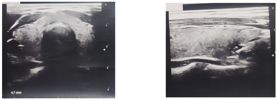 The ultrasound scan showed a hypoechogenic, non-homogeneous-structured, and normal-sized thyroid gland (Figure 2), as well as normal structures and sizes of the liver and the spleen.