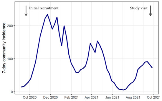This study analyzes cross-sectional seroprevalence data collected in Berlin in September 2021. Community incidence of SARS-CoV-2 infection in the preceding months varied greatly (Figure 1). The alpha variant (B.1.1.7) was replaced by the delta variant (B.1.617.2) starting in June 2021, reaching 99% by September 2021 [17]. Kindergartens were closed in the second lockdown in Germany between December 2020 and March 2021. This closure continued in Berlin until May 2021, except for children of essential workers such as health care professionals [18,19]. After reopening, kindergartens continued to follow distancing and hygiene rules. Wearing a facemask was mandatory only for contact between adults (staff and parents), but not for contact with and among children. In Germany, the first vaccinations against SARS-CoV-2 were available for adults from December 2020 following a prioritization scheme. From June 2021, children aged ≥12 years also had the opportunity to get vaccinated [20]. By September 2021, 68% of the German population had received at least one vaccination, whereas among children and adolescents aged 12–17 years, 59% were not yet vaccinated [21]. Vaccination against SARS-CoV-2 was not recommended for children of kindergarten age.