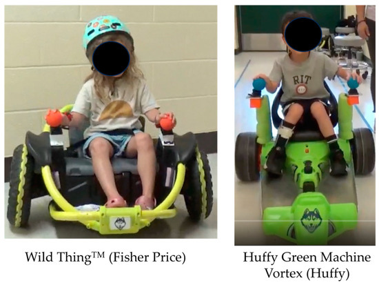 - James, D.; Pfaff, J.; Jeffries, L.M. Modified ride-on cars as early mobility for children with mobility limitations: A scoping review. Phys. Occup. Ther. Pediatr. 2019, 39, 525–542. [Google Scholar] [CrossRef] [PubMed]