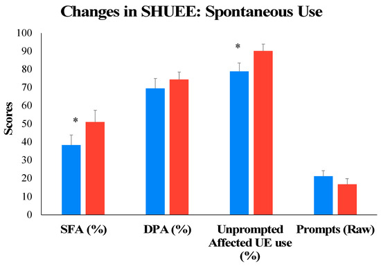 Training-related changes in motor function on the standardized SHUEE from pretest to posttest. * p