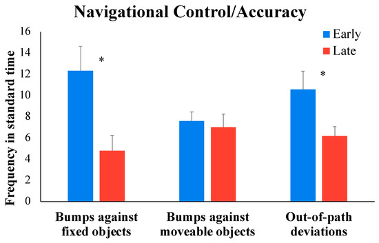 Dependent t tests on variables associated with navigational accuracy/control suggested a significant decrease from early to late sessions in bumps against fixed objects (t(10) = 4.566, p < 0.001) and out-of-path deviations (t(10) = 3.343, p = 0.007) but not bumps against moveable objects (t(10) = 0.391, p = 0.704). Specifically, 11 out of 11 children showed a large effect size (ES = 0.91) for decrease in bumps against fixed objects, and 9 out of 11 children showed a medium-sized decrease (ES = 0.70) in out-of-path deviations from early to late training sessions (see Figure 4 and Table 4 for details).