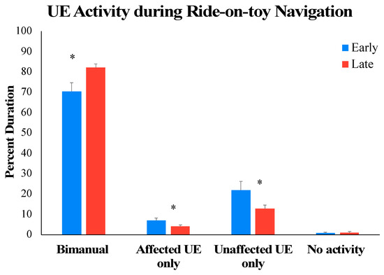 In terms of bimanual UE use, the repeated measures ANOVA indicated a significant main effect of arm activity (F (1.113, 11.132) = 237.290, p < 0.001, ηp2 = 0.960) and a significant arm activity × time interaction effect (F (1.177, 11.769) = 8.335, p = 0.011, ηp2 = 0.455). Post hoc analyses of the activity × time interaction suggested that overall, across early and late sessions, the children spent a significantly greater percentage of time engaged in bimanual versus unimanual and no-activity bouts (see Figure 5 and Table 4 for details). Moreover, from early to late sessions, children showed a medium-sized increase (ES = 0.78) in percent time in the session spent in bimanual activity, with a concurrent medium-sized decrease (ES = 0.57 to 0.75) in time spent in unimanual activity (see Figure 5, p-values < 0.05). All 11 children followed the group trends (see Table 4).