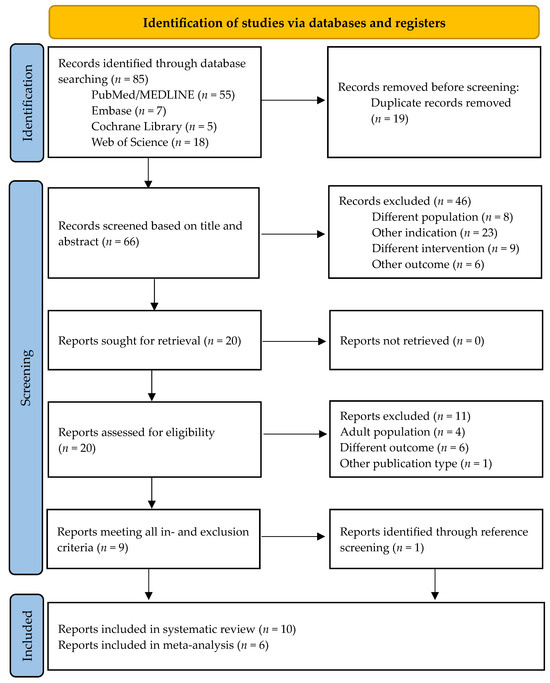 The initial search yielded 85 hits. After removing duplicates, 66 records were screened based on title and abstract. A total of 46 articles were excluded because they did not meet the inclusion criteria. Through a full-text assessment of the remaining articles, nine records were identified that were eligible to be included in the systematic review [25,26,27,28,29,30,31,32,33]. The references of these nine papers were screened, and one additional paper was identified as meeting all inclusion criteria [34]. This led to a total number of ten studies to be included in the systematic review. Of these ten records, six studies reported preoperative and postoperative resistive index of the testicular arteries. These were included in the meta-analysis. During the final search, one additional recent record was found through PubMed. This report did not meet the inclusion criteria. The selection process is summarized in Figure 1.