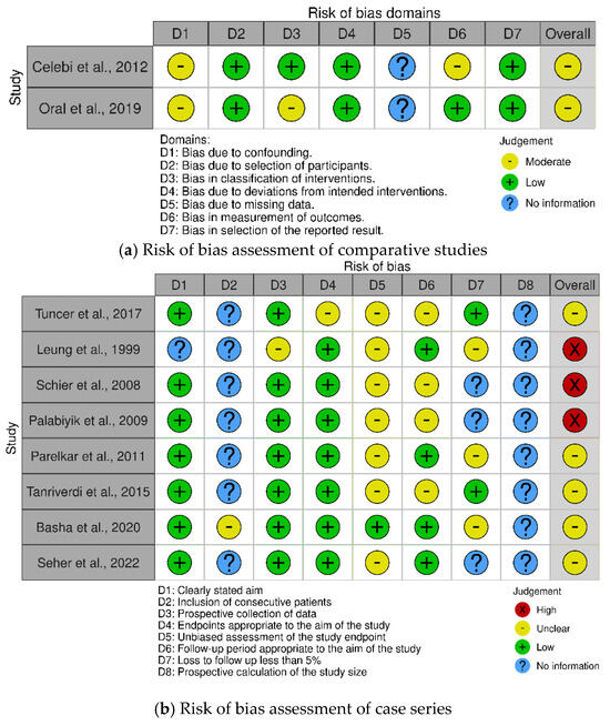For non-randomized comparative studies, the Risk of Bias in Non-randomized Studies of Interventions (ROBINS-I) tool was used [23,24]. Seven different items were scored as being ‘low’, ‘moderate’, ‘serious’, or ‘critical’ risk of bias if anything on that subject was reported in the paper. The different scores on the subdomains were then combined into an overall judgment. Two independent reviewers (RE and RK) performed the risk of bias analysis. In case of discrepancies, the matter was discussed, and a third reviewer (RV) was consulted until a consensus was reached.