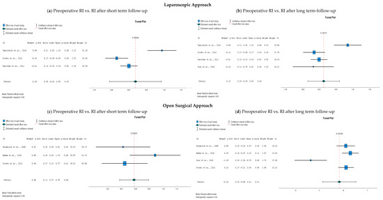 The data (RI for the centripetal artery, preoperative values compared to postoperative values) were pooled according to surgical technique and according to length of follow-up (Figure 3). Only for the data pooling of the RI of the short-term follow-up for the open surgical approach, the fixed effects model was used since the heterogeneity was low (I2 < 0.5); for the other analyses, the random effects model was used as I2 was > 0.5. I2 is reported with each forest plot in Figure 3. The data pooling revealed a statistically significant difference in preoperative RI and RI after short-term follow-up after the open surgical approach (p = 0.000, see Figure 3c). The differences between preoperative RI and RI at both short-term and long-term follow-up after laparoscopy were not significantly different (p = 0.63 and 0.60, respectively, see Figure 3a,b). In addition, there was no significant difference between the open approach and the long-term follow-up (p = 0.61, see Figure 3d).