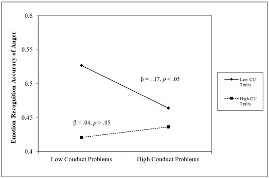 Another important advance provided by our study is the focus on the emotional recognition of anger, as well as fear. Overall, problems recognizing anger was also uniquely associated with CU traits and not conduct problems. These findings are consistent with those of Munõz [21], who reported that high levels of CU traits were related to more errors in labeling angry faces. These results are also consistent those of with a model proposed by Waller and Wagner [66], in which low threat sensitivity (e.g., ignoring signs of anger toward ones’ own behaviors on the part of parents, teachers, or peers) is considered an important causal factor to CU traits. These findings are important because research on emotional accuracy has not always focused on anger recognition, instead focusing more on the accurate recognition of fearful and sad faces. However, unlike for fear, we found a significant interaction between conduct problems and CU traits when testing anger recognition accuracy. Specifically, for those with strong CU traits, anger recognition accuracy was low overall and unrelated to the level of conduct problems (see Figure 1). In contrast, in those with weak CU traits, greater accuracy in recognizing anger led to fewer conduct problems. Given that this result was not predicted, it again should be interpreted cautiously. However, it illustrates the importance of considering CU traits when studying the emotional correlates of conduct problems, given that deficits associated with CU traits (e.g., problems recognizing anger) may mask deficits that may lead to conduct problems in those with weak CU traits.