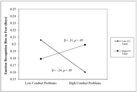 An important advance provided by our study was examining not only accuracy in emotional recognition, which has been the focus of many past studies, but also emotional recognition biases, which have not been the focus of much past work in relation to CU traits. While our results did not show a consistent bias to fear (i.e., a tendency to attribute fear to other emotions) related to CU traits, there was a significant interaction between conduct problems and CU traits that was unique to boys. Specifically, only in boys, conduct problems were negatively associated with bias in fear recognition but only at low levels of CU traits. Importantly, this interaction was not predicted a priori and, as a result, needs to be interpreted cautiously. However, these findings would be consistent with the violence inhibition mechanism (VIM) model of aggression [65], suggesting that observing distress in others (such as seeing fear in the eyes of others) promotes empathy and inhibits responses that would harm others. Our results, if replicated, would suggest that this mechanism may only be operating for those with weak CU traits. In our sample, an increase in a tendency to overinterpret fear cues in others led to more conduct problems in those with strong CU traits, which could mean that in this group, fearful cues in others could signal an increased vulnerability and susceptibility to be attacked rather than signaling a need for empathy [23]. Importantly, while the significant interaction does suggest that interpreting fear cues differ in their relationship with conduct problems depending on the level of CU traits in boys, neither of these simple slopes reached significance.