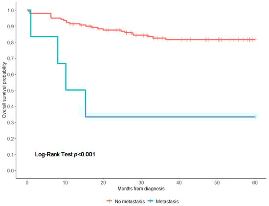 The 5-year OS rate of all patients was 79.6% (95% confidence interval (CI), 75–87%) (Figure 1). Patients treated with surgery alone had a significantly higher 5-year OS than those who had surgery/CTx or surgery/CTx/RTx (94.8% vs. 76.5% vs. 80.0%, respectively, log-rank test; p < 0.0001). Patients who received chemotherapy alone had the worst OS (25.0%) (Figure 2). Notably, patients who presented with metastasis had a worse 5-year overall survival compared to those who did not have metastasis (33.3% vs. 82.1%, p < 0.001) (Figure 3). Additionally, there were no significant differences in the 5-year OS of patients based on study period (2004–2009 OS, 77.6%; 2010–2014 OS, 90.8%; and 2015–2019 OS, 75.3% (p = 0.08)) (Figure 4 and Figure S1). On the multivariate analysis, the presence of metastasis at diagnosis was associated with a worse survival (adjusted Hazard Ratio (aHR), 9.14; 95% CI, 2.22 -37.7; p < 0.002) (Table 3).