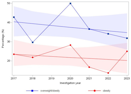 When analyzed by sex, in female children, the percentage of overweight/obesity changed from 27.3 (95% CI 14.1–40.5)% in 2017 to 33.3 (95% CI 12.9–53.1)% in 2023 (Supplementary Material, Table S3). In boys, the percentage of overweight/obesity was 55.6 (95% CI 42.3–68.9)% in 2017; by 2023, it was 30.4 (95% CI 11.6–49.2)%. In no case was the trend of the percentage of overweight/obesity and obesity significant throughout the years (p ≥ 0.082) (Supplementary Material, Table S3).