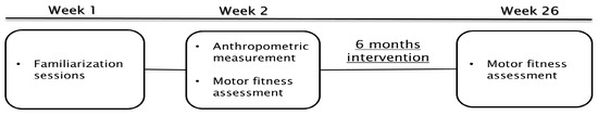 This controlled two-group, repeated-measures experimental study aimed to explore the impact of a specific SMA program on MF in preschool children. Participants were randomly assigned to either the SMA (N = 28) group or the free-play (FRP) (N = 25) group. The randomization process was performed by an online randomizer tool https://www.randomizer.org/ (accessed on 1 April 2023). MF variables were evaluated before and after a 6-month period. All subjects underwent two pre-visits to become acquainted with the motor test, and they were instructed to refrain from physical activity and solid food intake 2 h before testing. The intervention took place during regular school/kindergarten hours to ensure adherence and to assess the feasibility of integrating such a program into the physical education curriculum [25]. Figure 1 illustrates the flowchart of the experimental design.
