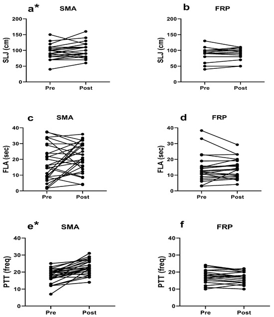 Individual trend of changes before (pre) and after (post) of 6 months of different school activities, for the following variables: standing long jump test (SLJ) (a) for structured movement activities group (SMA), (b) and free-play group (FRP); flamingo test (FLA) (c) for SMA, (d) for FRP; plate tapping test (PTT) (e) for SMA, (f) for FRP; * significantly different pre- to post-test using paired samples t-test (p < 0.05).