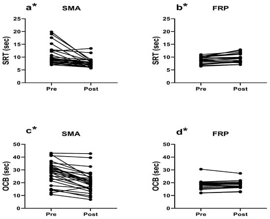 Individual trend of changes before (pre) and after (post) of 6 months of different school activities, for the following variables: agility test (SRT) (a) for structured movement activities group (SMA), (b) and free-play group (FRP); obstacle course backwards test (OCB) (c) for SMA, (d) for FRP; * significantly different pre- to post-test using paired samples t-test (p < 0.05).