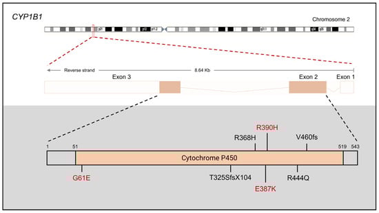 Gene structure of CYP1B1 and the locations of the most prevalent mutations associated with primary congenital glaucoma (PCG). The most common mutations reported across different populations are indicated in red, while mutations specific to certain populations are shown in black.