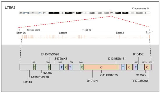LTBP2, located on chromosome 14q24 within the GLC3D locus, is composed of 36 exons and encodes a matrix protein containing 1821 amino acids (aa) (Figure 2) []. In 2009, Ail et al. identified four homozygous null mutations in LTBP2, including p.Ala138fs*278 (p.A138PfsX278), p.Arg299*(p.R299X), p.Glu415fs*596 (p.E415RfsX596), and p.Gln111*(p.Q111X), as causative mutations of PCG in consanguineous families from Pakistan and individuals of Gypsy ethnicity []. Among these mutations, the truncating LTBP2 p.Arg299* (p.R299X) mutation is the most prevalent Gypsy PCG mutation, accounting for approximately one-third of disease alleles (33.8%, from 34 families) []. In the same year, Narooie-Nejad et al. performed whole-genome autozygosity mapping in Iranian PCG families and identified two loss-of-function (LoF) mutations in LTBP2 (p.S472fsX3 and p.Y1793fsX55) []. Subsequently, in 2016, Micheal et al. reported two novel mutations (p.R1645E and p.D1345Gfs*6) from consanguineous Pakistani PCG families using whole-exome sequencing []. Three novel LTBP2 mutations (p.D1010N, p.Q1143Rfs*35, and p.C1757Y) were recently discovered in three consanguineous Pakistani PCG families [].