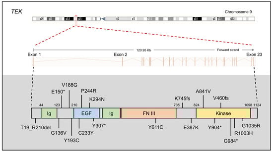 The TEK gene comprises 23 coding exons encoding a principal product of 1124 aa. In 2016, Souma et al. first identified 10 heterozygous novel/rare TEK variants (p.T19_R210del, p.E150*, p.C233Y, p.K294N, p.Y307*, p.Y611C, p.K745fs, p.G984*, c.760+2T>C, and c.3300+2delT) as disease-causing mutations following dominant inheritance []. Seven of these mutations lead to abnormal LoF, including the absence of intact protein production, increased proteasomal degradation, impaired phosphorylation of critical tyrosine residue, changes in subcellular localization and diminished responsiveness to ligands, and protein aggregation. The remaining three mutations are also likely to be disease-associated. TEK could be implicated in the etiology of PCG, supported by their findings of the PCG-like phenotype in Angpt1/Angpt2 and Tek conditional KO mice []. In 2020, Young et al. identified eight TEK variants in families affected by PCG (p.G136V, p.Y904*, p.V188G, p.Y193C, p.P244R, p.A841V, p.G1035R, and c.1624 +5G>A), further supporting TEK’s role as a causative factor in PCG []. A subsequent study in China demonstrated that TEK mutations, particularly p.R1003H located in the protein kinase domain, may act as pathogenic mutation and contribute to PCG []. Taken together, these findings underscore the fact that defects in the ANGPT–TIE pathway caused by reduced TEK constitute a novel mechanism of the PCG disease. It is likely that investigating additional genes involved in forming and maintaining the ANGPT–TIE pathway could provide further insights.