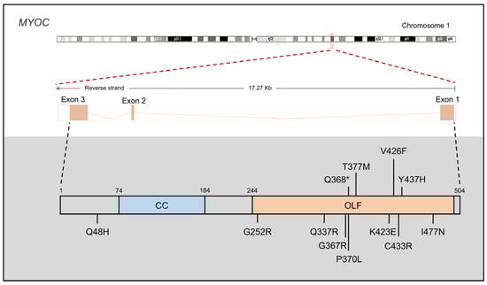 The MYOC gene, also known as the TM-inducible glucocorticoid response (TIGR) gene, is located on chromosome 1q24 and contains three exons. In 1997, Stone et al. initially linked MYOC mutations to JOAG []. While MYOC mutations can lead to both JOAG and adult-onset POAG, the majority of these mutations result in JOAG, often manifesting as a familial disease []. Currently, over 250 MYOC mutations have been reported, of which 37.7% are considered pathogenic []. Notably, approximately 97% of disease-causing MYOC mutations localize to exon 3, which encodes the olfactomedin homology domain (myocilin allele-specific phenotype database: myocilin.com, accessed on 24 January 2024). Although most pathogenic MYOC mutations are missense alleles (84%), the most common MYOC mutation identified in JOAG is a nonsense mutation known as p.Gln368stop, causing protein aggregation []. In addition to being a prevalent JOAG-causing mutation, MYOC p.Pro370Leu is associated with severe pathology [], and MYOC p.Tyr437His is correlated with the form of glaucoma characterized by an earlier age of onset and significantly elevated IOP levels []. Moreover, nine additional MYOC mutations have been identified by multiple independent research groups (Figure 5). Furthermore, certain MYOC mutations, including p.N57D [], p.C245Y [], p.P274R [], p.I345M [], p.T377R [], p.D384H [], p.E385K [], p.Y453Mfs*11 [], and p.I499S [], have been exclusively reported by single research teams.