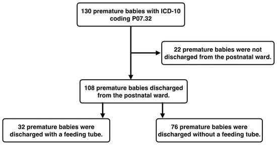 Between 1 January 2019 and 31 December 2020, 130 premature babies with the main diagnosis P07.32 were cared for. Of these, 108 premature babies were cared for exclusively at the maternity ward and could also be discharged home with their mothers. Of these, 32 premature babies with a feeding tube and 76 premature babies without a feeding tube were discharged home. The recruitment process of the patients can be seen as a flow diagram in Figure 1.