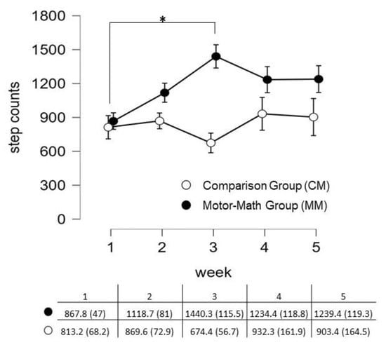 Mean (SE) step counts recorded during class, once weekly over the five-week implementation period of the motor–math (MM) and comparison (CM) group. * Statistically significant difference.
