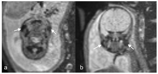 (a,b) Echo planar imaging at TE42 demonstrates low signal buccal fat pads in this 28-week gestational age fetus with diaphragmatic hernia (arrows).